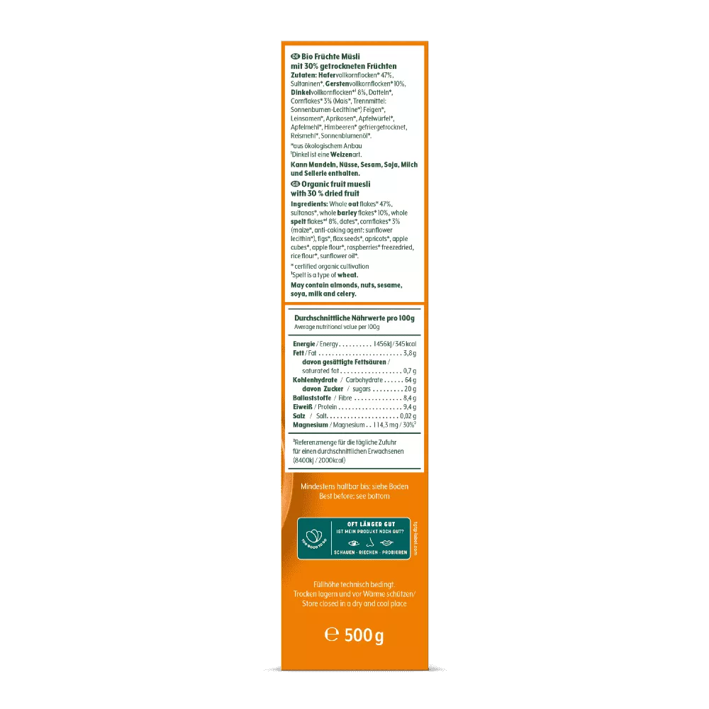 HAFERvollkornflocken* 47 %, Sultaninen*, GERSTENvollkornflocken* 10 %, DINKELvollkornflocken*¹ 8 %, Datteln*, Cornflakes* 3% (Mais*, Trennmittel: Sonnenblumen-Lecithine*), Feigen*, Leinsamen*, Aprikosen*, Apfelwürfel*, Apfelmehl*, Himbeeren* gefriergetrocknet, Reismehl*, Sonnenblumenöl*.