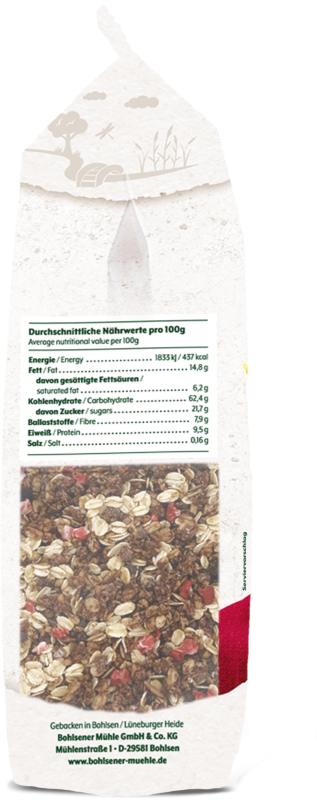Die Vollkorn-Dinkelflocken aus regionalem Getreide entstehen in der eigenen Wassermühle mitten in Bohlsen und werden in der Produktion mit sorgsam ausgewählten Bio-Zutaten gemischt. Gute Zutaten, sehr viel Fingerspitzengefühl und ganz viel Handwerkswissen - das schmeckt man!