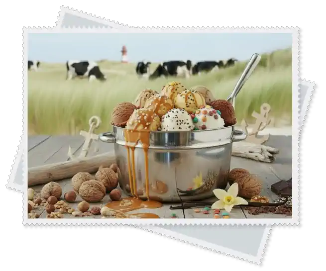 Unsere besonderen Küsten-Eis Sorten entstehen aus der gleichen hochwertigen Weidemilch und mit derselben Leidenschaft wie unser klassisches Sortiment. Hier wagen wir uns an ausgefallene Geschmackskombinationen und regionale Spezialitäten: Von cremigem Eierlikör über das maritime Karamell-Ostseesalz bis hin zu intensivem Lakritz oder zartem Marzipan.