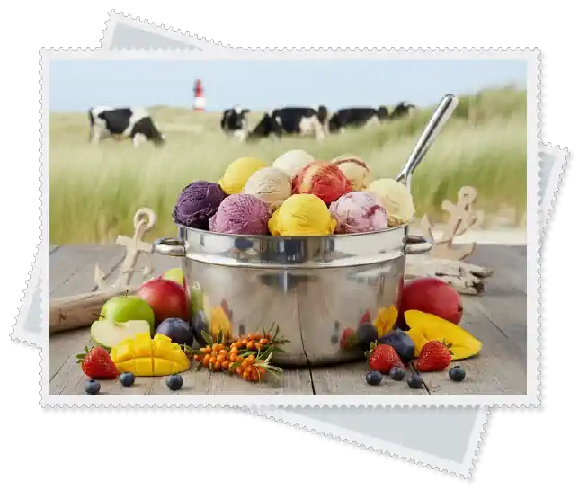 Besondere Highlights sind unsere Ki/Ba-Mischung (Kirsch-Banane), die erfrischende Zitrone und unser einzigartiges Sauerrahm-Heidelbeere-Eis, das die Säure der Beeren perfekt mit cremiger Milde ausbalanciert . Auch saisonale Raritäten wie Pflaume und der vitaminreiche Sanddorn zeigen unsere Verbundenheit zur norddeutschen Küstenregion. Purer Fruchtgenuss ohne künstliche Aromen – so schmeckt der Sommer an der Küste das ganze Jahr über.